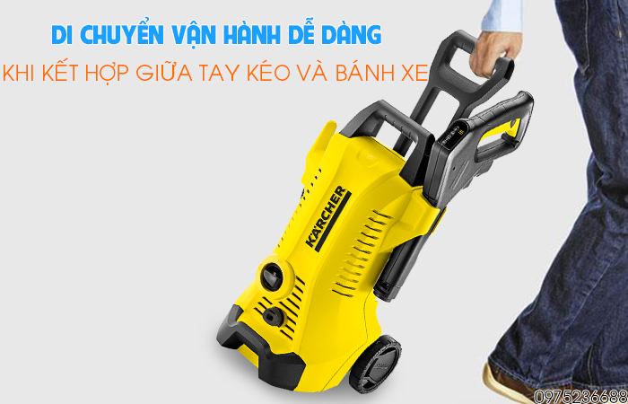 Karcher K3 Full Control EU được tối ưu hóa thiết kế nhỏ gọn, giúp tiết kiệm được đáng kể không gian sinh hoạt. Tay xách và bánh xe giúp việc di chuyển máy phun cao áp Karcher K3 Full Control EU qua các khu vực thật nhẹ nhàng, không tốn nhiều công sức.